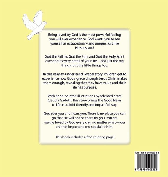 Being loved by God is the most powerful feeling you will ever experience. God wants you to see yourself as extraordinary and unique, just like He sees you! God the Father, God the Son, and God the Holy Spirit care about every detail of your life-not just the big things, but the little things too. In this easy-to-understand Gospel story, children get to experience how God's grace through Jesus Christ makes them enough, demonstrating that they have value and their life has purpose. With hand-painted illustrations by talented artist Claudia Gadotti, this story brings The Good News to life in a child-friendly and impactful way, God sees you and hears you. There is no place you can go that He will not be there for you. You are always loved by God every day, no matter what-you are that important and special to Him! This book reveals God the Father, God the Son, God the Holy Spirit and is designed to motivate the child to ask questions all throughout the story. Depending on their walk, each child's mindset will be different. Encourage the reader to allow for this. There is so much more to the story of Jesus that when discussed will result in growing in your faith. May God richly bless you as you hear His story. Use the content in this book to explore Scripture in the Bible. From 1 to 99 years old and beyond, if you don't know Jesus, allow this book to pierce your heart with His love. *This book includes a free coloring page* A portion of all proceeds goes to charity. Any questions contact HISway47@gmail.com