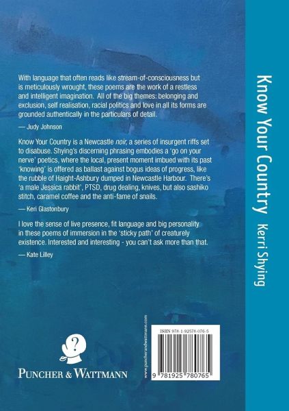 With language that often reads like stream-of-consciousness but is meticulously wrought, these poems are the work of a restless and intelligent imagination. All of the big themes: belonging and exclusion, self realisation, racial politics and love in all its forms are grounded authentically in the particulars of detail. - Judy Johnson Know Your Country is a Newcastle noir, a series of insurgent riffs set to disabuse. Shying's discerning phrasing embodies a 'go on your nerve' poetics, where the local, present moment imbued with its past 'knowing' is offered as ballast against bogus ideas of progress, like the rubble of Haight-Ashbury dumped in Newcastle Harbour. There's 'a male Jessica rabbit', PTSD, drug dealing, knives, but also sashiko stitch, caramel coffee and the anti-fame of snails. - Keri Glastonbury I love the sense of live presence, fit language and big personality in these poems of immersion in the 'sticky path' of creaturely existence. Interested and interesting - you can't ask more than that. - Kate Lilley