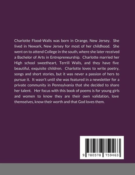 (Author) Charlotte Flood-Walls was born in Orange, New Jersey. She lived in Newark, New Jersey for most of her childhood. She went on to attend College in the south, where she later received a Bachelor of Arts in Entrepreneurship. Charlotte married her High school sweetheart, Terrill Walls, and they have five beautiful, exquisite children. Charlotte loves to write poetry, songs and short stories, but it was never a passion of hers to pursue it. It wasn't until she was featured in a newsletter for a private community in Pennsylvania that she decided to share her talent. Her focus with this book of poems is for young girls and women to know they are their own validation, love themselves, know their worth and that God loves them. (Illustrator) Mildred Kathy Flood was born in Orange, New Jersey. She was raised and educated in East Orange and Newark, New Jersey. She raised her five beautiful children as a single mother. Her style of art has always been an inspiration to her family and closest friends. She was forced to share her Artistry with the world by most of her family and friends, but she refused and only did it for fun and was selective of who she drew for. However, one of her nieces was very persistent and not taking no for an answer finally convinced her to share her drawings at 66 years old. The Art presented here in Know Your Worth is a reflection of young women and girls and the seasoned women who paved the way for us.