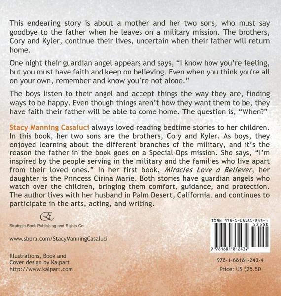 This endearing story is about a mother and her two sons, who must say goodbye to the father when he leaves on a military mission. The brothers, Cory and Kyler, continue their lives, uncertain when their father will return home. One night their guardian angel appears and says, "I know how you're feeling, but you must have faith and keep on believing. Even when you think you're all on your own, remember and know you're not alone." The boys listen to their angel and accept things the way they are, finding ways to be happy. Even though things aren't how they want them to be, they have faith their father will be able to come home. The question is, "When?" Stacy Manning Casaluci always loved reading bedtime stories to her children. In this book, her two sons are the brothers, Cory and Kyler. As boys, they enjoyed learning about the different branches of the military, and it's the reason the father in the book goes on a Special-Ops mission. She says, "I'm inspired by the people serving in the military and the families who live apart from their loved ones." In her first book, Miracles Love a Believer, her daughter is the Princess Cirina Marie. Both stories have guardian angels who watch over the children, bringing them comfort, guidance, and protection. The author lives with her husband in Palm Desert, California, and continues to participate in the arts, acting, and writing.