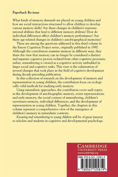 What kinds of memory demands are placed on young children and how are social interactions structured to allow children to develop various memory skills? Are there changes in children's representational abilities that lead to different memory abilities? How do individual differences affect children's memory performance? Are there age-related changes in children's autobiographical memories? These are among the questions addressed in this third volume in the Emory Cognition Project series, originally published in 1990. Although the contributors examine memory in different ways, they share the view that memory can no longer be considered a distinct and separate cognitive process isolated from other cognitive processes; rather, remembering is viewed as a cognitive activity embedded in larger social and cognitive tasks. This view is the culmination of several changes that took place in the field of cognitive development during the decade preceding publication.