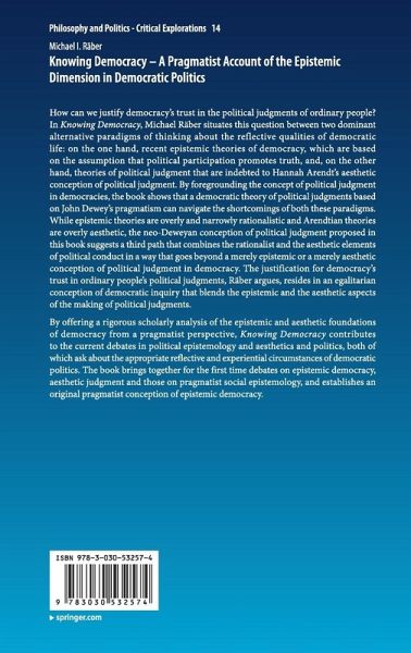 How can we justify democracy's trust in the political judgments of ordinary people? In Knowing Democracy, Michael Räber situates this question between two dominant alternative paradigms of thinking about the reflective qualities of democratic life: on the one hand, recent epistemic theories of democracy, which are based on the assumption that political participation promotes truth, and, on the other hand, theories of political judgment that are indebted to Hannah Arendt's aesthetic conception of political judgment. By foregrounding the concept of political judgment in democracies, the book shows that a democratic theory of political judgments based on John Dewey's pragmatism can navigate the shortcomings of both these paradigms. While epistemic theories are overly and narrowly rationalistic and Arendtian theories are overly aesthetic, the neo-Deweyan conception of political judgment proposed in this book suggests a third path that combines the rationalist and the aesthetic elements of political conduct in a way that goes beyond a merely epistemic or a merely aesthetic conception of political judgment in democracy. The justification for democracy's trust in ordinary people's political judgments, Räber argues, resides in an egalitarian conception of democratic inquiry that blends the epistemic and the aesthetic aspects of the making of political judgments.