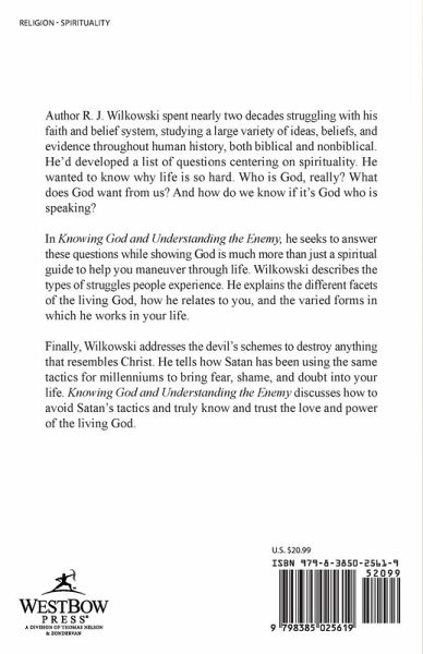 Author R. J. Wilkowski spent nearly two decades struggling with his faith and belief system, studying a large variety of ideas, beliefs, and evidence throughout human history, both biblical and nonbiblical. He'd developed a list of questions centering on spirituality. He wanted to know why life is so hard. Who is God, really? What does God want from us? And how do we know if it's God who is speaking? In Knowing God and Understanding the Enemy, he seeks to answer these questions while showing God is much more than just a spiritual guide to help you maneuver through life. Wilkowski describes the types of struggles people experience. He explains the different facets of the living God, how he relates to you, and the varied forms in which he works in your life. Finally, Wilkowski addresses the devil's schemes to destroy anything that resembles Christ. He tells how Satan has been using the same tactics for millenniums to bring fear, shame, and doubt into your life. Knowing God and Understanding the Enemy discusses how to avoid Satan's tactics and truly know and trust the love and power of the living God.