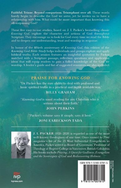 Faithful. Triune. Beyond comparison. Triumphant over all. These words barely begin to describe the God we serve, yet he invites us to have a relationship with him. What could be more important than knowing this all-surpassing God? These five easy-to-use Bible studies, based on J. I. Packer's bestselling classic Knowing God, explore the character and actions of God throughout Scripture. They encourage us to look for God every time we read the Bible and to deepen our understanding, trust, and worship in response. In honor of the fiftieth anniversary of Knowing God, this edition of the Knowing God Bible Study helps individuals and groups explore and apply biblical truths. Each session features an insightful quotation by Packer matched with a Scripture passage, reflection questions, and application ideas that will equip readers to gain a fuller knowledge of the God we worship. A leader's guide and list of suggested resources are also included. Also available: Knowing God Devotional Journal, Knowing God Study Guide, and Knowing God Fiftieth Anniversary Edition.