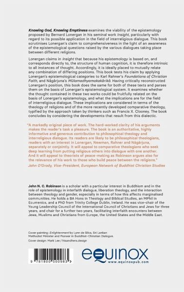 Knowing God, Knowing Emptiness examines the viability of the epistemology proposed by Bernard Lonergan in his seminal work Insight, particularly with regard to its possible application in the field of interreligious dialogue. This book scrutinises Lonergan's claim to comprehensiveness in the light of an awareness of the epistemological questions raised by the various dialogues taking place between different religions. Lonergan claims in Insight that because his epistemology is based on, and corresponds directly to, the structure of human cognition, it is therefore intrinsic to all instances of thought. Accordingly, it is ideally placed to mutually relate any combination of differing positions. This book tests his claim by applying Lonergan's epistemological categories to Karl Rahner's Foundations of Christian Faith, and N¿g¿rjuna's M¿lamadhyamakak¿rik¿. Having critically reconstructed Lonergan's position, this book does the same for both of these texts and parses them on the basis of Lonergan's epistemological system. It examines whether the thought contained in these two works could be fruitfully related on the basis of Lonergan's epistemology, and what the implications are for the field of interreligious dialogue. These implications are considered in terms of the theology of religions and of the more recently developed comparative theology, typified by the approach taken by thinkers such as Francis X. Clooney. The book concludes by considering the developments that result from this dialectic.
