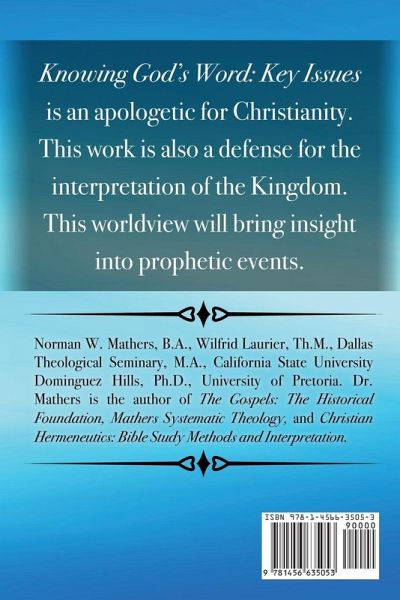 Knowing God's Word: Key Issues is an apologetic for Christianity. This work is also a defense for the interpretation of the Kingdom. This worldview will bring insight into prophetic events. Norman W. Mathers, B.A., Wilfrid Laurier, Th.M., Dallas Theological Seminary, M.A., California State University Dominguez Hills, Ph.D., University of Pretoria. Dr. Mathers is the author of The Gospels: The Historical Foundation, Mathers Systematic Theology, and Christian Hermeneutics: Bible Study Methods and Interpretation.