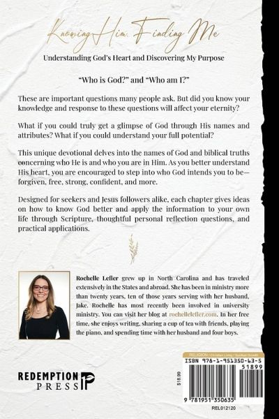 "Who is God?" and "Who am I?" These are important questions many people ask. But did you know¿your knowledge and response to these questions will affect your eternity? What if you could truly get a glimpse of God through His names and attributes? What if you could understand your full potential? This unique devotional delves into the names of God and biblical truths concerning who He is and who you are in Him. As you better understand His heart, you are encouraged to step into who God intends you to be-forgiven, free, strong, confident, and more. Designed for seekers and Jesus followers alike, each chapter gives ideas on how to know God better and apply the information to your own life through Scripture, thoughtful personal reflection questions, and practical applications.