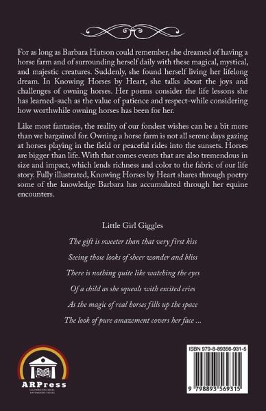 For as long as Barbara Hutson could remember, she dreamed of having a horse farm and of surrounding herself daily with these magical, mystical, and majestic creatures. Suddenly, she found herself living her lifelong dream. In Knowing Horses by Heart, she talks about the joys and challenges of owning horses. Her poems consider the life lessons she has learned-such as the value of patience and respect-while considering how worthwhile owning horses has been for her. Like most fantasies, the reality of our fondest wishes can be a bit more than we bargained for. Owning a horse farm is not all serene days gazing at horses playing in the field or peaceful rides into the sunsets. Horses are bigger than life. With that comes events that are also tremendous in size and impact, which lends richness and color to the fabric of our life story. Fully illustrated, Knowing Horses by Heart shares through poetry some of the knowledge Barbara has accumulated through her equine encounters. Little Girl GigglesThe gift is sweeter than that very first kissSeeing those looks of sheer wonder and blissThere is nothing quite like watching the eyesOf a child as she squeals with excited criesAs the magic of real horses fills up the spaceThe look of pure amazement covers her face ...