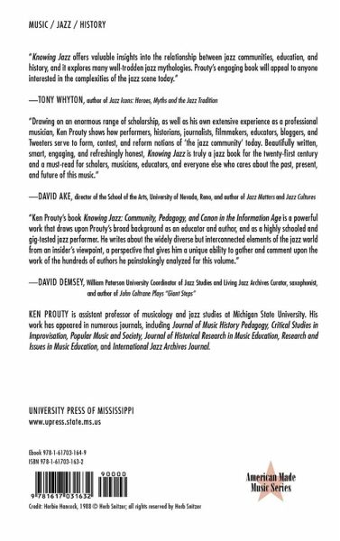 How the claim to jazz knowledge forges community and forms an understanding of canon Ken Prouty argues that knowledge of jazz, or more to the point, claims to knowledge of jazz, are the prime movers in forming jazz's identity, its canon, and its community. Every jazz artist, critic, or fan understands jazz differently, based on each individual's unique experiences and insights. Through playing, listening, reading, and talking about jazz, both as a form of musical expression and as a marker of identity, each aficionado develops a personalized relationship to the larger jazz world. Through the increasingly important role of media, listeners also engage in the formation of different communities that not only transcend traditional boundaries of geography, but increasingly exist only in the virtual world. The relationships of "jazz people" within and between these communities is at the center of Knowing Jazz. Some groups, such as those in academia, reflect a clash of sensibilities between historical traditions. Others, particularly online communities, represent new and exciting avenues for everyday fans, whose involvement in jazz has often been ignored. Other communities seek to define themselves as expressions of national or global sensibility, pointing to the ever-changing nature of jazz's identity as an American art form in an international setting. What all these communities share, however, is an intimate, visceral link to the music and the artists who make it, brought to life through the medium of recording. Informed by an interdisciplinary approach and approaching the topic from a number of perspectives, Knowing Jazz charts a philosophical course in which many disparate perspectives and varied opinions on jazz can find common ground.