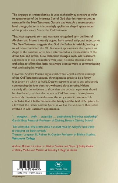 The language of 'christophanies' is used technically by scholars to refer to appearances of the incarnate Son of God after his resurrection, as narrated in the New Testament Gospels and Acts. At a more popular level, though, the term is increasingly applied to alleged appearances of the pre-incarnate Son in the Old Testament. That Jesus appeared to - and was even recognized by - the likes of Abraham and Moses is usually argued from several scriptural trajectories. The New Testament suggests that God the Father is invisible, inviting us to ask who conducted the Old Testament appearances; the mysterious Angel of the Lord has often been interpreted as a manifestation of the divine Son; and several New Testament passages imply Old Testament appearances of and encounters with Jesus. It seems obvious, indeed orthodox, to affirm that Jesus has always been at work in communicating with and saving his world. However, Andrew Malone argues that, while Christ-centred readings of the Old Testament abound, christophanies prove to be a flimsy foundation on which to build. Despite apparent success, any scholarship commending the idea does not withstand close scrutiny. Malone carefully sifts the evidence to show that the popular arguments should be abandoned, and that the pursuit of Old Testament christophanies ultimately threatens to undermine the very values it promotes. He concludes that it better honours the Trinity and the text of Scripture to allow that the Father and the Spirit, as well as the Son, were themselves involved in Old Testament appearances.