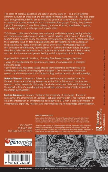 The areas of personal genomics and citizen science draw on - and bring together - different cultures of producing and managing knowledge and meaning. They also cross local and global boundaries, are subjects and objects of transformation and mobility of research practices, evaluation and multi-stakeholder groups. Thirdly, they draw on logics of 'convergence': new links between, and new kinds of, stakeholders, spaces, knowledge, practices, challenges and opportunities. This themed collection of essays from nationally and internationally leading scholars and commentators advances and widens current debates in Science and Technology Studies and in Science Policy concerning 'converging technologies' by complementing the customary focus on technical aspirations for convergence with the analysis of the practices and logics of scientific, social and cultural knowledge production that constitute contemporary technoscience. In case studies from across the globe, contributors discuss the ways in which science and social order are linked in areas such as direct-to consumer genetic testing and do-it-yourself biotechnologies. Organised into thematic sections, 'Knowing New Biotechnologies' explores: ¿ ways of understanding the dynamics and logics of convergences in emergent biotechnologies ¿ governance and regulatory issues around technoscientific convergences ¿ democratic aspects of converging technologies - lay involvement in scientific research and the co-production of biotechnology and social and cultural knowledge.