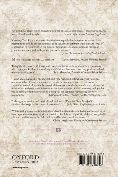 Historians have traditionally seen domestic service as an obsolete or redundant sector from the middle of the twentieth century. Knowing Their Place challenges this by linking the early twentieth-century employment of maids and cooks to later practices of employing au pairs, mothers' helps, and cleaners. Lucy Delap tells the story of lives and labour within British homes, from great houses to suburbs and slums, and charts the interactions of servants and employers along with the intense controversies and emotions they inspired. Knowing Their Place also examines the employment of men and migrant workers, as well as the role of laughter and erotic desire in shaping domestic service. The memory of domestic service and the role of the past in shaping and mediating the present is examined through heritage and televisual sources, from Upstairs, Downstairs to The 1900 House. Drawing from advice manuals, magazines, novels, cinema, memoirs, feminist tracts, and photographs, this fascinating book points to new directions in cultural history through its engagement in innovative areas such as the history of emotions and cultural memory. Through its attention to the contemporary rise in the employment of domestic workers, Knowing Their Place sets modern Britain in a new and compelling historical context.
