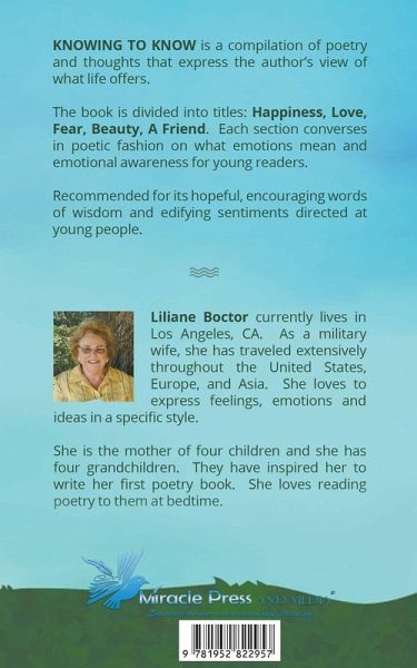 Knowing to Know is a compilation of poetry and thoughts that express the author's view of what life offers. The book is divided into titles: Happiness, Love, Fear, Beauty, A Friend. Each section converses in poetic fashion on what emotions mean and emotional awareness for young readers. Recommended for its hopeful, encouraging words of wisdom and edifying sentiments directed at young people.