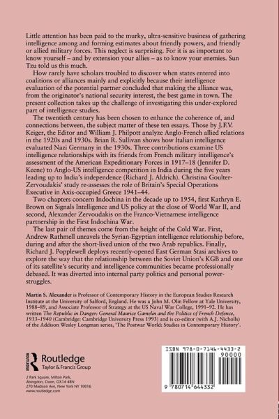 Little attention has been paid to the murky, ultra-business of gathering intelligence among and forming estimates about friendly powers, and friendly or allied military forces. How rarely have scholars troubled to discover when states entered into coalitions or alliances mainly and explicitly because their intelligence evaluation of the potential partner concluded that making the alliance was, from the originator's national security interest, the best game in town. The twentieth century has been chosen to enhance the coherence of and connections between, the subject matter of this under-explored part of intelligence studies.