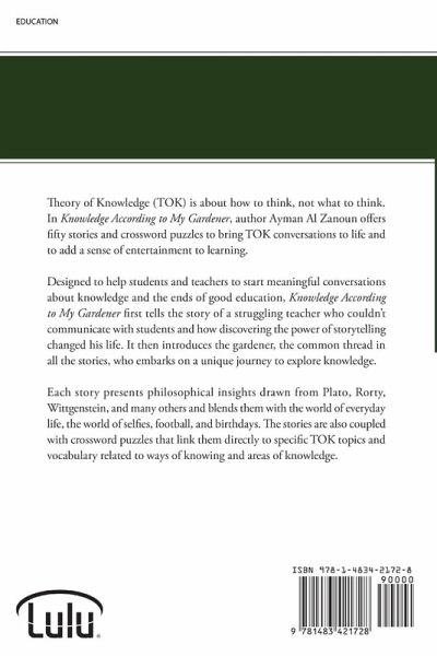 Theory of Knowledge (TOK) is about how to think, not what to think. In Knowledge According to My Gardener, author Ayman Al Zanoun offers fifty stories and crossword puzzles to bring TOK conversations to life and to add a sense of entertainment to learning. Designed to help students and teachers to start meaningful conversations about knowledge and the ends of good education, Knowledge According to My Gardener first tells the story of a struggling teacher who couldn't communicate with students and how discovering the power of storytelling changed his life. It then introduces the gardener, the common thread in all the stories, who embarks on a unique journey to explore knowledge. Each story presents philosophical insights drawn from Plato, Rorty, Wittgenstein, and many others and blends them with the world of everyday life, the world of selfies, football, and birthdays.