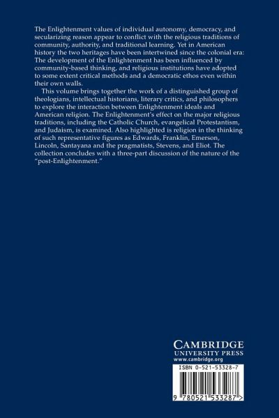 The Enlightenment values of individual autonomy, democracy, and secularizing reason conflict with the religious traditions of community, authority, and traditional learning. Yet in American history the two heritages have been intertwined since the colonial era: the development of the Enlightenment has been influenced by community-based thinking and religious institutions have adopted to an extent critical methods and a democratic ethos even within their own walls. This volume unites the work of a distinguished group of theologians, historians, literary critics, and philosophers to explore the interaction between Enlightenment ideals and American religion. The Enlightenment's effect on the major religious traditions, including the Catholic Church, Evangelical Protestantism, and Judaism, is examined. Also highlighted is religion in the thinking of such representative figures as Edwards, Franklin, Emerson, Lincoln, Santayana, and the Pragmatists, Stevens and Eliot.
