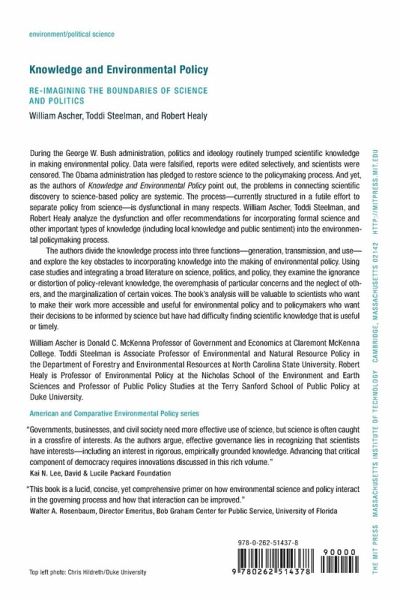 An analysis of the challenges involved in incorporating science and other kinds of knowledge into making environmental policy. During the George W. Bush administration, politics and ideology routinely trumped scientific knowledge in making environmental policy. Data were falsified, reports were edited selectively, and scientists were censored. The Obama administration has pledged to restore science to the policy making process. And yet, as the authors of Knowledge and Environmental Policy point out, the problems in connecting scientific discovery to science-based policy are systemic. The process—currently structured in a futile effort to separate policy from science—is dysfunctional in many respects. William Ascher, Toddi Steelman, and Robert Healy analyze the dysfunction and offer recommendations for incorporating formal science and other important types of knowledge (including local knowledge and public sentiment) into the environmental policymaking process.The authors divide the knowledge process into three functions—generation, transmission, and use—and explore the key obstacles to incorporating knowledge into the making of environmental policy. Using case studies and integrating a broad literature on science, politics, and policy, they examine the ignorance or distortion of policy-relevant knowledge, the overemphasis of particular concerns and the neglect of others, and the marginalization of certain voices. The book's analysis will be valuable to scientists who want to make their work more accessible and useful to environmental policy and to policymakers who want their decisions to be informed by science but have had difficulty finding scientific knowledge that is useful or timely.