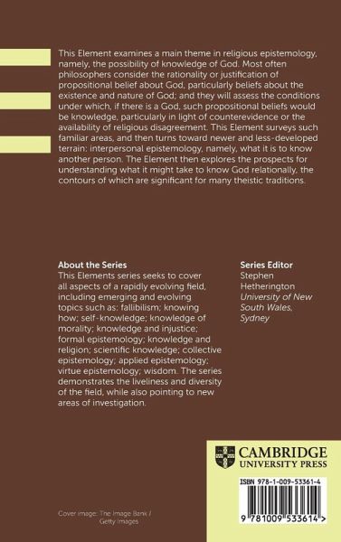 This Element examines a main theme in religious epistemology, namely, the possibility of knowledge of God. Most often philosophers consider the rationality or justification of propositional belief about God, particularly beliefs about the existence and nature of God; and they will assess the conditions under which, if there is a God, such propositional beliefs would be knowledge, particularly in light of counter-evidence or the availability of religious disagreement. This Element surveys such familiar areas, then turns toward newer and less-developed terrain: interpersonal epistemology, namely what it is to know another person. It then explores the prospects for understanding what it might take to know God relationally, the contours of which are significant for many theistic traditions.