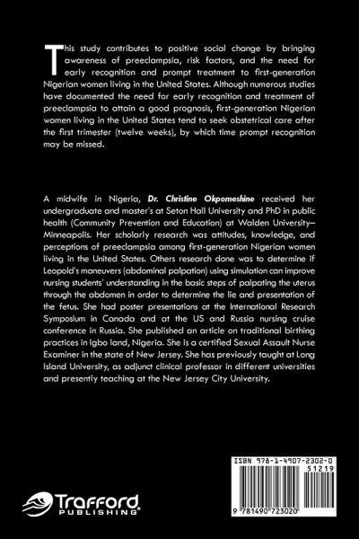 This study contributes to positive social change by bringing awareness of preeclampsia, risk factors, and the need for early recognition and prompt treatment to first-generation Nigerian women living in the United States. Although numerous studies have documented the need for early recognition and treatment of preeclampsia to attain a good prognosis, first-generation Nigerian women living in the United States tend to seek obstetrical care after the first trimester (twelve weeks), by which time prompt recognition may be missed.