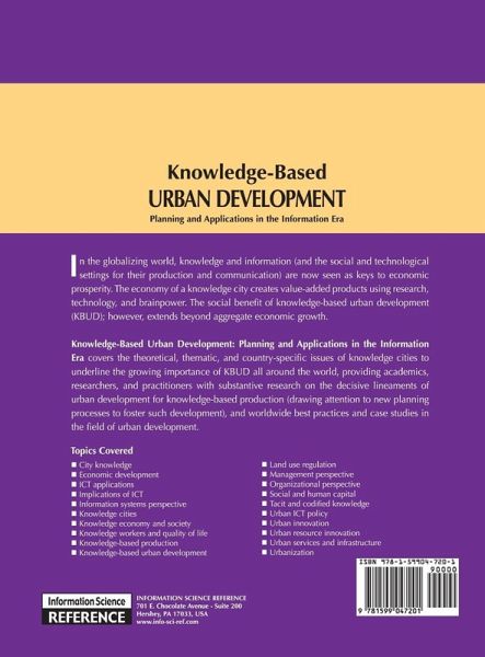 In the globalizing world, knowledge and information (and the social and technological settings for their production and communication) are now seen as keys to economic prosperity. The economy of a knowledge city creates value-added products using research, technology, and brainpower. The social benefit of knowledge-based urban development (KBUD); however, extends beyond aggregate economic growth. Knowledge-Based Urban Development: Planning and Applications in the Information Era covers the theoretical, thematic, and country-specific issues of knowledge cities to underline the growing importance of KBUD all around the world, providing academics, researchers, and practitioners with substantive research on the decisive lineaments of urban development for knowledge-based production (drawing attention to new planning processes to foster such development), and worldwide best practices and case studies in the field of urban development.
