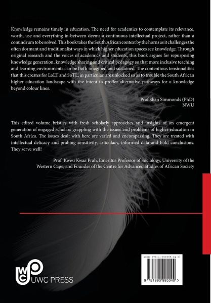 Knowledge remains timely in education. The need for academics to contemplate its relevance, worth, use and everything in-between deems a continuous intellectual project, rather than a conundrum to be solved. This book takes the South African context by the horns as it challenges the often dormant and traditionalist ways in which higher education spaces see knowledge. Through original research and the voices of academics and students, this book argues for repurposing knowledge generation, knowledge sharing and critical pedagogy so that more inclusive teaching and learning environments can be both imagined and sustained. The contentious tensionalities that this creates for LoLT and SoTL, in particular, are unlocked so as to trouble the South African higher education landscape with the intent to proffer alternative pathways for a knowledge beyond colour lines. Prof Shan Simmonds (PhD) NWU This edited volume bristles with fresh scholarly approaches and insights of an emergent generation of engaged scholars grappling with the issues and problems of higher education in South Africa. The issues dealt with here are varied and encompassing. They are treated with intellectual delicacy and probing sensitivity, articulacy, informed data and bold conclusions. They serve well! Prof. Kwesi Kwaa Prah Emeritus Professor of Sociology University of the Western Cape Founder of the Centre for Advanced Studies of African Society