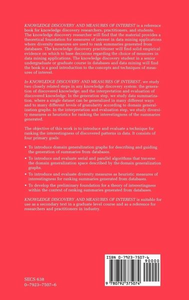 Knowledge Discovery and Measures of Interest is a reference book for knowledge discovery researchers, practitioners, and students. The knowledge discovery researcher will find that the material provides a theoretical foundation for measures of interest in data mining applications where diversity measures are used to rank summaries generated from databases. The knowledge discovery practitioner will find solid empirical evidence on which to base decisions regarding the choice of measures in data mining applications. The knowledge discovery student in a senior undergraduate or graduate course in databases and data mining will find the book is a good introduction to the concepts and techniques of measures of interest.