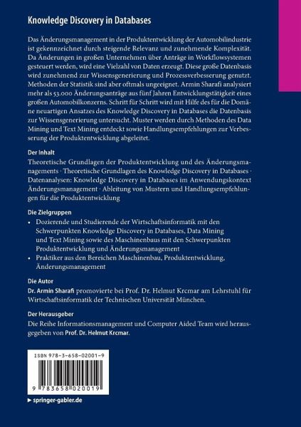 Das Änderungsmanagementin der Produktentwicklung der Automobilindustrie ist gekennzeichnet durchsteigende Relevanz und zunehmende Komplexität. Da Änderungen in großenUnternehmen über Anträge in Workflowsystemen gesteuert werden, wird eineVielzahl von Daten erzeugt. Diese große Datenbasis wird zunehmend zurWissensgenerierung und Prozessverbesserung genutzt. Methoden der Statistik sindaber oftmals ungeeignet. Armin Sharafi analysiert mehr als 53.000Änderungsanträge aus fünf Jahren Entwicklungstätigkeit eines großenAutomobilkonzerns. Schritt für Schritt wird mit Hilfe des für die Domäneneuartigen Ansatzes des Knowledge Discovery in Databases die Datenbasis zurWissensgenerierung untersucht. Muster werden durch Methoden des Data Mining undText Mining entdeckt und Handlungsempfehlungen zur Verbesserung derProduktentwicklung abgeleitet.