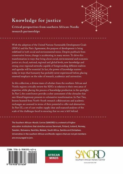 With the adoption of the United Nations Sustainable Development Goals (SDGs) and the Paris Agreement, the purpose of development is being redefined in both social and environmental terms. Despite pushback from conservative forces, change is accelerating in many sectors. To drive this transformation in ways that bring about social, environmental and economic justice at a local, national, regional and global levels, new knowledge and strong cross-regional networks capable of foregrounding different realities, needs and agendas will be essential. In fact, the power of knowledge matters today in ways that humanity has probably never experienced before, placing an emphasis on the roles of research, academics and universities. In this collection, an international diverse collection of scholars from the southern African and Nordic regions critically review the SDGs in relation to their own areas of expertise, while placing the process of knowledge production in the spotlight. In Part I, the contributors provide a sober assessment of the obstacles that neo-liberal hegemony presents to substantive transformation. In Part Two, lessons learned from North-South research collaborations and academic exchanges are assessed in terms of their potential to offer real alternatives. In Part III, a set of case studies supply clear and nuanced analyses of the scale of the challenges faced in ensuring that no one is left behind. This accessible and absorbing collection will be of interest to anyone interested in North-South research networks and in the contemporary debates on the role of knowledge production. The Southern African-Nordic Centre (SANORD) is a network of higher education institutions that stretches across Denmark, Finland, Iceland, Norway, Sweden, Botswana, Namibia, Malawi, South Africa, Zambia and Zimbabwe. Universities in the southern African and Nordic regions that are not yet members are encouraged to join.