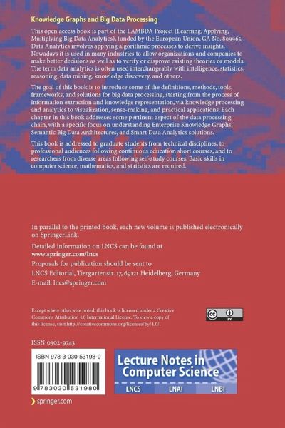 The goal of this book is to introduce some of the definitions, methods, tools, frameworks, and solutions for big data processing, starting from the process of information extraction and knowledge representation, via knowledge processing and analytics to visualization, sense-making, and practical applications. Each chapter in this book addresses some pertinent aspect of the data processing chain, with a specific focus on understanding Enterprise Knowledge Graphs, Semantic Big Data Architectures, and Smart Data Analytics solutions.