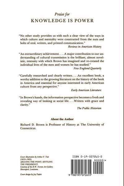 Brown here explores America's first communications revolution--the revolution that made printed goods and public oratory widely available and, by means of the steamboat, railroad and telegraph, sharply accelerated the pace at which information travelled. He describes the day-to-day experiences of dozens of men and women, and in the process illuminates the social dimensions of this profound, far-reaching transformation. Brown begins in Massachusetts and Virginia in the early 18th century, when public information was the precious possession of the wealthy, learned, and powerful, who used it to reinforce political order and cultural unity. Employing diaries and letters to trace how information moved through society during seven generations, he explains that by the Civil War era, cultural unity had become a thing of the past. Assisted by advanced technology and an expanding economy, Americans had created a pluralistic information marketplace in which all forms of public communication--print, oratory, and public meetings--were competing for the attention of free men and women. Knowledge is Power provides fresh insights into the foundations of American pluralism and deepens our perspective on the character of public communications in the United States.