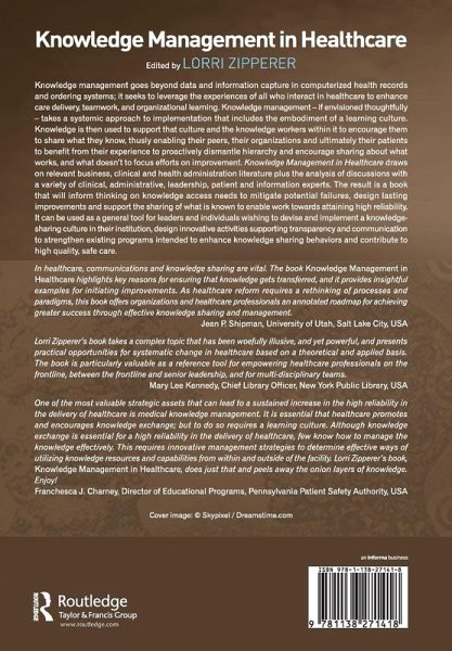 Knowledge management goes beyond data and information capture in computerized health records and ordering systems; it seeks to leverage the experiences of all who interact in healthcare to enhance care delivery, teamwork, and organizational learning. Knowledge management - if envisioned thoughtfully - takes a systemic approach to implementation that includes the embodiment of a learning culture. Knowledge is then used to support that culture and the knowledge workers within it to encourage them to share what they know, thusly enabling their peers, their organizations and ultimately their patients to benefit from their experience to proactively dismantle hierarchy and encourage sharing about what works, and what doesn't to focus efforts on improvement. Knowledge Management in Healthcare draws on relevant business, clinical and health administration literature plus the analysis of discussions with a variety of clinical, administrative, leadership, patient and information experts. The result is a book that will inform thinking on knowledge access needs to mitigate potential failures, design lasting improvements and support the sharing of what is known to enable work towards attaining high reliability. It can be used as a general tool for leaders and individuals wishing to devise and implement a knowledge-sharing culture in their institution, design innovative activities supporting transparency and communication to strengthen existing programs intended to enhance knowledge sharing behaviours and contribute to high quality, safe care.