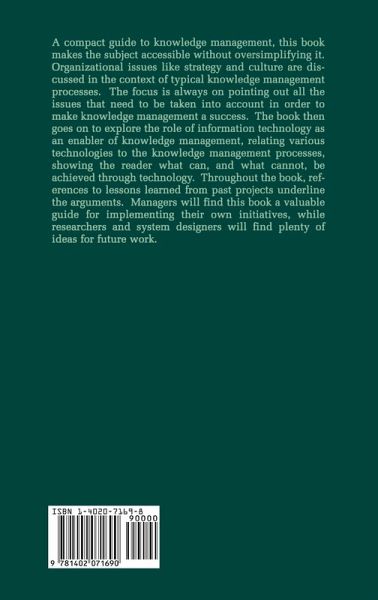A compact guide to knowledge management, this book makes the subject accessible without oversimplifying it. Organizational issues like strategy and culture are discussed in the context of typical knowledge management processes. The focus is always on pointing out all the issues that need to be taken into account in order to make knowledge management a success. The book then goes on to explore the role of information technology as an enabler of knowledge management relating various technologies to the knowledge management processes, showing the reader what can, and what cannot, be achieved through technology. Throughout the book, references to lessons learned from past projects underline the arguments. Managers will find this book a valuable guide for implementing their own initiatives, while researchers and system designers will find plenty of ideas for future work.