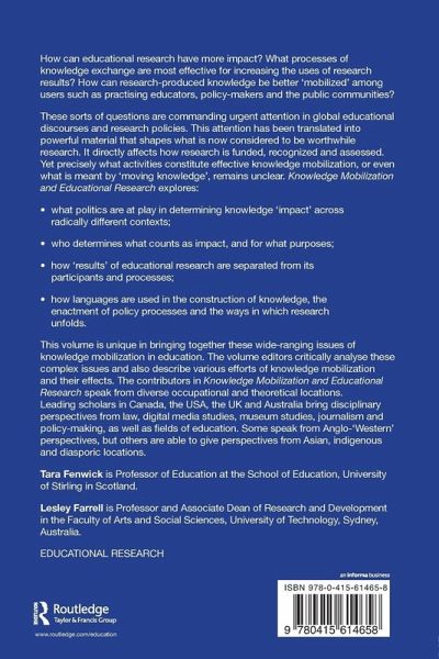 How can educational research have more impact? What processes of knowledge exchange are most effective for increasing the uses of research results? How can research-produced knowledge be better 'mobilized' among users such as practicing educators, policy makers, and the public communities? These sorts of questions are commanding urgent attention in educational discourses and research policies now circulating around the world. This attention has been translated into powerful material exercises that shape what is considered to be worthwhile research and how research is funded, recognized, and assessed. Yet precisely what activities constitute effective knowledge mobilization, or even what is meant by 'moving knowledge', remains unclear. What politics are at play in determining knowledge 'impact' across radically different contexts? Who determines what counts as impact, and for what purposes? How are 'results' of educational research separated from its participants and processes? In addition knowledge mobilization also invokes debates about the languages through which knowledge is constructed, policy processes are enacted, and research unfolds. This volume is unique in bringing together these wide-ranging issues of knowledge mobilization in education. The volume editors critically analyse these complex issues and also describe various efforts of knowledge mobilization and their effects. While the contributors themselves speak from diverse material, occupational and theoretical locations. Leading scholars in Canada, the US, the UK, and Australia bring disciplinary perspectives from law, digital media studies, museum studies, journalism and policy-making as well as fields of education. Some speak from Anglo-'Western' perspectives but others such as Phan Le Ha (Vietnamese), Rui Yang (Chinese) and Dolores van der Wey (Haida/West Coat Salish First Nations) speak from Asian, Indigenous and diasporic locations.