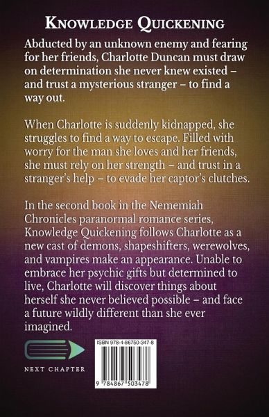 Abducted by an unknown enemy and fearing for her friends, Charlotte Duncan must draw on determination she never knew existed - and trust a mysterious stranger - to find a way out. When Charlotte is suddenly kidnapped, she struggles to find a way to escape. Filled with worry for the man she loves and her friends, she must rely on her strength - and trust in a stranger's help - to evade her captor's clutches. In the second book in the Nememiah Chronicles paranormal romance series, Knowledge Quickening follows Charlotte as a new cast of demons, shapeshifters, werewolves, and vampires make an appearance. Unable to embrace her psychic gifts but determined to live, Charlotte will discover things about herself she never believed possible - and face a future wildly different than she ever imagined.
