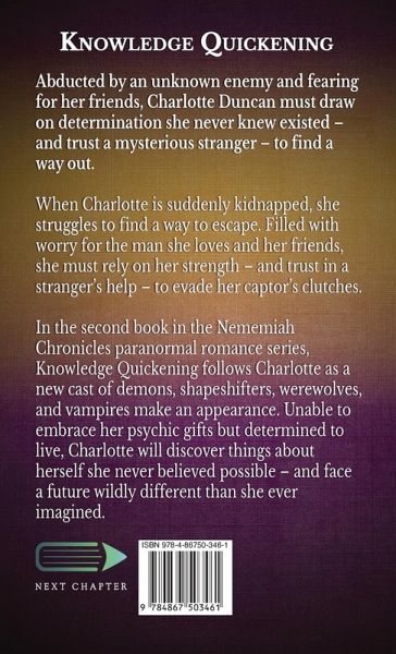 Abducted by an unknown enemy and fearing for her friends, Charlotte Duncan must draw on determination she never knew existed - and trust a mysterious stranger - to find a way out. When Charlotte is suddenly kidnapped, she struggles to find a way to escape. Filled with worry for the man she loves and her friends, she must rely on her strength - and trust in a stranger's help - to evade her captor's clutches. In the second book in the Nememiah Chronicles paranormal romance series, Knowledge Quickening follows Charlotte as a new cast of demons, shapeshifters, werewolves, and vampires make an appearance. Unable to embrace her psychic gifts but determined to live, Charlotte will discover things about herself she never believed possible - and face a future wildly different than she ever imagined.