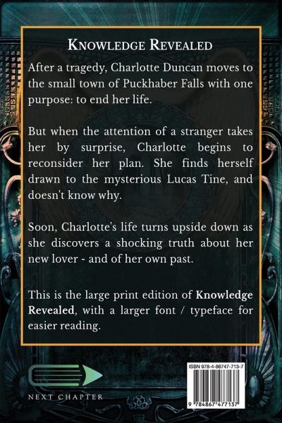 After a tragedy, Charlotte Duncan moves to the small town of Puckhaber Falls with one purpose: to end her life. But when the attention of a stranger takes her by surprise, Charlotte begins to reconsider her plan. She finds herself drawn to the mysterious Lucas Tine, and doesn't know why. Soon, Charlotte's life turns upside down as she discovers a shocking truth about her new lover - and of her own past. This is the large print edition of Knowledge Revealed, with a larger font / typeface for easier reading.¿
