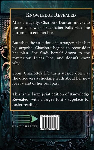 After a tragedy, Charlotte Duncan moves to the small town of Puckhaber Falls with one purpose: to end her life. But when the attention of a stranger takes her by surprise, Charlotte begins to reconsider her plan. She finds herself drawn to the mysterious Lucas Tine, and doesn't know why. Soon, Charlotte's life turns upside down as she discovers a shocking truth about her new lover - and of her own past. This is the large print edition of Knowledge Revealed, with a larger font / typeface for easier reading.¿