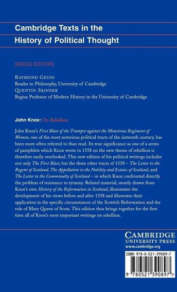 John Knox's First Blast of the Trumpet against the Monstrous Regiment of Women, one of the most notorious political tracts of the sixteenth century, has been more often referred to than read. Its true significance as one of a series of pamphlets which Knox wrote in 1558 on the theme of rebellion is therefore easily overlooked. This new edition of his writings includes not only The First Blast, but the three other tracts of 1558 -The Letter to the Regent of Scotland, The Appellation to the Scottish Nobility, and The Letter to the Commonalty of Scotland - in which Knox confronted the problem of resistance to tyranny. Related material, mostly drawn from Knox's own History of the Reformation in Scotland, illuminates the development of his views before 1558 and illustrates their application in the specific circumstances of the Scottish Reformation and the rule of Mary Queen of Scots. This edition thus brings together for the first time all of Knox's most important writings on rebellion.