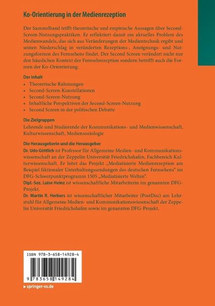Der Sammelband trifft theoretische und empirische Aussagen über Second Screen-Nutzungspraktiken. Er reflektiert damit ein aktuelles Problem des Medienwandels, das sich aus Veränderungen der Medientechnik ergibt und seinen Niederschlag in veränderten Rezeptions-, Aneignungs- und Nutzungsformen findet. Diese erweitern die Fernsehrezeption über die Angebote des Second Screen aus dem häuslichen sozialen Kontext heraus interaktiv, zeitlich entbunden und delokalisiert. Die Beiträge untersuchen die veränderten Nutzungspraktiken mit Blick auf Aspekte der Ko-Orientierung.