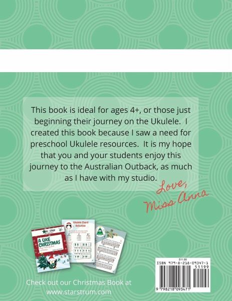 Koala's Campfire Songs & Activities: Starstrum Ukulele for Kids Ages 4+ This book is ideal for ages 4+, or those beginning their journey with the Ukulele. This book will delight your young Ukulele students with fun, interactive worksheets, activities and songs. Take your students on a journey to the Australian Outback they won't soon forget. Teachers: keep your prep time low with this book. This book includes:Lovable Ukulele Buddy to attach to you Ukulele Ukulele Strings Activity Pages Ukulele Frets & Tabs Activity Pages Games Finger Exercises 1 Finger Chords & Tabs Strumming Patterns Play the Uke Row, Row, Row Your Boat Kookaburra Sits in the Old Gum Tree Waltzing Matilda Many more songs Practice Tracker This will be a well loved companion for your young Ukulele Student!