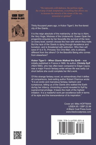 Thirty thousand years ago, in Kobor Tigan't, the five-tiered city of the Giants... It is the reign absolute of the matriarchy: at the top is Abim, the Very Huge, Mistress of the Underworld; Queen Opak the progenitrix ensures by her fecundity the survival of the race; on every level, women choose the men with whom they mate. But the race of the Giants is dying through decadence and boredom; and is threatened with extinction. Who then will save it? Is it To, Princess Ta's One Man, who is already different from the others? Or the Beautiful Being who comes from elsewhere? Kobor Tigan't - When Giants Walked the Earth - was initially published in France by Robert Laffont in 1969. Its author, Christia Sylf (1924-1980), who has often been compared to Edgar Cayce, was a major French fantasy writer whose life was sadly cut short before she could complete her life's work. Of this strange fantasy novel, so extraordinary that it defies all comparisons, best-selling author Robert Charroux wrote: "It is an erotic and marvelous fantasy, barbaric and sumptuous, telling us of the Giants who walked the Earth during her infancy, chronicling a world revealed to Sylf by supranormal privilege. It bears the mark of the highest initiation. It is a masterful work per excellence both in terms of its style and the transcendence of its inspiration." Contents: Introduction by Jean-Marc Lofficier Kobor Tigan't (1969) ¿ 1 ... 5 6 7 8 9 ... 38 ¿