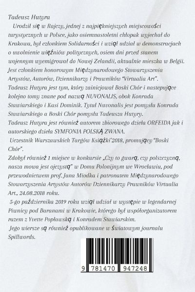KOCHANKOWIE WIECZNO¿CI, z podtytüem Z ¿YWOTA ARONY & FARONA, autorstwa: Tadeusz Hutyra jest zbiorem poezji o dwóch kochankach wiecznöci, Arony i Farona. Magiczne strofy kulminuj¿ce akcj¿ w Nowym Jorku... W ró¿nych zwierciad¿ach rzeczywistöci... Faron i Arona nie s¿ zwyk¿ymi ¿miertelnikami, ich ¿ywot trwa od czasów staröytnych faraonów ä po dzie¿ dzisiejszy i nic nie zapowiada temu rych¿ego köca, obdarzeni iskr¿ wiecznöci z tego czy innego powodu przez samego Boga Wszechmog¿cego... Tadeusz Hutyra Urodzi¿ si¿ w Rajczy, jednej z najpi¿kniejszych miejscowöci turystycznych w Polsce, jako osiemnastoletni ch¿opak wyjechä do Krakowa, by¿ cz¿onkiem Solidarnöci i wzi¿¿ udziä w demonstracjach o uwolnienie wi¿¿niów politycznych, osiem dni przed stanem wojennym wyemigrowä do Nowej Zelandii, aktualnie mieszka w Belgii. Jest cz¿onkiem honorowym Mi¿dzynarodowego Stowarzyszenia Artystów, Autorów, Dziennikarzy i Prawników "Virtualia Art". Tadeusz Hutyra jest tym, który zainicjowä Boski Chór i nastepuj¿ce kolejno tomy znane pod nazw¿ NUVONALIS, obok Konrada Stawiarskiego i Kasi Dominik. Tytü Nuvonalis jest pomys¿u Konrada Stawiarskiego a Boski Chór pomys¿u Tadeusza Hutyry. Tadeusz Hutyra jest równie¿ autorem zbiorowego dzie¿a ORFEIDA jak i autorskiego dzie¿a SYMFONIA POLSK¿ ZWANA. Uczestnik Warszawskich Targów Ksi¿¿ki'2018, promuj¿cy "Boski Chór". Zdoby¿ równie¿ 1 miejsce w konkursie "Czy to gwar¿, czy polszczyzn¿, nasza mowa jest ojczyst¿" w Domu Polonijnym we Wroc¿awiu, pod przewodnictwem prof. Jana Miodka i patronatem Mi¿dzynarodowego Stowarzyszenia Artystów Autorów Dziennikarzy Prawników Virtualia Art., 24.08.2018 roku. 5-go pädziernika 2019 roku wzi¿¿ udziä w wyst¿pie w legendarnej Piwnicy pod Baranami w Krakowie, którego by¿ wspó¿organizatorem razem z Yvette Pop¿awsk¿ i Konradem Stawiarskim. Jego wiersze s¿ równie¿ opublikowane w ¿wiatowym journalu Spillwords.