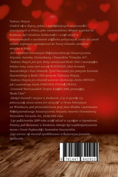 KOCHANKOWIE WIECZNO¿CI, z podtytüem AMOR AETERNUS /wieczna mi¿ö¿/, autorstwa: Tadeusz Hutyra jest zbiorem poezji o dwóch kochankach wiecznöci, Arony i Farona. Magiczne strofy ponadczasowego ¿ywota obojga bohaterów na przestrzeni millenniów, akcja g¿ównie w czasach obecnych... Jest to drugie, pe¿niejsze wydanie tomiku pod tym samym tytüem, z tym, ¿e podtytü w pierwszym wydaniu brzmi: Z ¿YWOTA ARONY & FARONA. Portret to obojga bohaterów w ró¿nych zwierciad¿ach rzeczywistöci... Faron i Arona nie s¿ zwyk¿ymi ¿miertelnikami, ich ¿ywot trwa od czasów staröytnych faraonów ä po dzie¿ dzisiejszy i nic nie zapowiada temu rych¿ego köca, obdarzeni s¿ iskr¿ wiecznöci z tego czy innego powodu przez samego Boga Wszechmog¿cego... O autorze: Tadeusz Hutyra urodzi¿ si¿ w Rajczy, jednej z najpi¿kniejszych miejscowöci turystycznych w Polsce, jako osiemnastoletni ch¿opak wyjechä do Krakowa, by¿ cz¿onkiem Solidarnöci i wzi¿¿ udziä w demonstracjach o uwolnienie wi¿¿niów politycznych, osiem dni przed stanem wojennym wyemigrowä do Nowej Zelandii, aktualnie mieszka w Belgii. Jest cz¿onkiem honorowym Mi¿dzynarodowego Stowarzyszenia Artystów, Autorów, Dziennikarzy i Prawników "Virtualia Art". Tadeusz Hutyra jest tym, który zainicjowä "Boski Chór" i nastepuj¿ce kolejno tomy znane pod nazw¿ NUVONALIS, obok Konrada Stawiarskiego i Kasi Dominik. Tytü Nuvonalis jest pomys¿u Konrada Stawiarskiego a Boski Chór pomys¿u Tadeusza Hutyry. Tadeusz Hutyra jest równie¿ autorem zbiorowego dzie¿a ORFEIDA jak i autorskiego dzie¿a SYMFONIA POLSK¿ ZWANA. Jest równie¿ autorem wielu innych tomików, w tym takich, jak "Mi¿ö¿ i Wiecznö¿", "Polska w Szacie Wolnöci" czy "Persja w Szacie Wiecznöci". Ma na swoim koncie równie¿ sporo tomów i tomików poezji w j¿zyku angielskim. Uczestnik Warszawskich Targów Ksi¿¿ki'2018, promuj¿cy "Boski Chór". Zdoby¿ równie¿ 1 miejsce w konkursie ¿Czy to gwar¿, czy polszczyzn¿, nasza mowa jest ojczyst¿" w Domu Polonijnym we Wroc¿awiu, pod przewodnictwem prof. Jana Miodka i patronatem Mi¿dzynarodowego Stowarzyszenia Artystów Autorów Dziennikarzy Prawników Virtualia Art., 24.08.2018 roku. 5-go pädziernika 2019 roku wzi¿¿ udziä w wyst¿pie w legendarnej Piwnicy pod Baranami w Krakowie, którego by¿ wspó¿organizatorem razem z Yvette Pop¿awsk¿ i Konradem Stawiarskim. Jego wiersze s¿ równie¿ opublikowane w ¿wiatowym journalu Spillwords.
