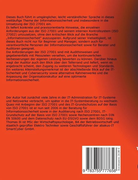 Dieses Buch führt in umgänglicher, leicht verständlicher Sprache in dieses weitläufige Thema der Informationssicherheit und insbesondere in die Umsetzung der ISO 27001 ein. Es liefert konkrete und praxisorientierte Hinweise, die einzelnen Anforderungen aus der ISO 27001 und seinem internen Kontrollsystem (ISO 27002) umzusetzen, ohne den kritischen Blick auf die Branche 'Informationssicherheit' auszusparen. Aufgrund seiner Vielseitigkeit, ist dieses Buch nicht nur für Beginner und Manager, sondern auch für verantwortliche Personen der Informationssicherheit sowie für Berater und Auditoren geeignet. Die Anforderungen der ISO 27001 sind mit Audithinweisen und gegebenenfalls mit Messzielen versehen, um die kontinuierlichen Verbesserungen der eigenen Leistung bewerten zu können. Darüber hinaus wagt der Auditor auch den Blick über den Tellerrand und liefert, wenn es angebracht scheint, den Zugang zu weiteren Technologien und Standards.Ein weiteres Alleinstellungsmerkmal ist der abschließende Blick auf die IT-Sicherheit und Cybersecurity sowie alternative Rahmenwerke und die Anpassung der Organisationskultur auf eine optimierte Informationssicherheit.