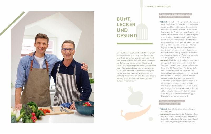 Fußballstar aus München trifft auf Top-Ernährungsmediziner aus Hamburg - zusammen sind Thomas Müller und Dr. Matthias Riedl das perfekte Team! Der eine weiß aus eigener Erfahrung, wie er seinen Körper und seine Leistung mit gesundem Essen pushen kann. Der andere bringt als Experte das wissenschaftliche Knowhow mit. Gemeinsam verfolgen sie ein Ziel: umfassend über gesunde Ernährung zu informieren und zu zeigen, wie viel Spaß Kochen mit vielen Zutaten machen kann.