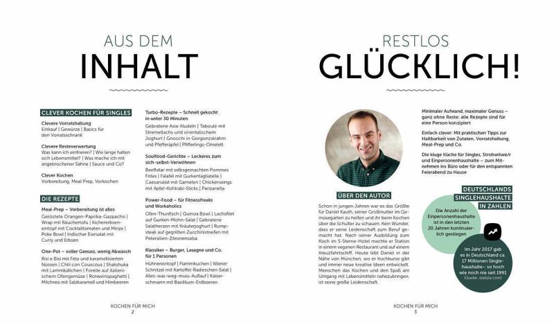 In Deutschland leben 41% der Menschen alleine - Singles, Witwen oder Paare in Fernbeziehungen. Für sie ist dieses Buch - denn nur, weil man alleine isst, soll es ja trotzdem schmecken! Die Rezepte sind so konzipiert, dass keine Reste übrig bleiben und für jeden Geschmack etwas dabei ist: Es gibt einfache One-Pot-Gerichte und schnelle Turbo-Gerichte unter 30 Minuten, Soulfood für die Seele, wenn der Tag mal nicht so schön war, Klassiker wie Omas Gemüseintopf oder Burger und gesunde Rezepte von Low Carb bis zuckerfrei, aber auch Couch-Potato-Sünden, wenn der Liebste mal beim Fußball ist. Praktische Tipps zur Haltbarkeit von Zutaten und Meal Prep runden das Buch ab.