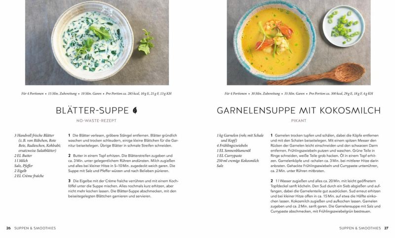 Rote-Bete-Salat mit Apfel oder Linsensalat mit Tempeh Tomaten-Tartelettes oder Kräuter-OmelettMakrelen-Rillettes und Rote-Linsen-Dip Garnelensuppe mit Kokosmilch sowie Maronen-CremesuppeFrühstücks-Smoothie oder doch Grüner Smoothie?