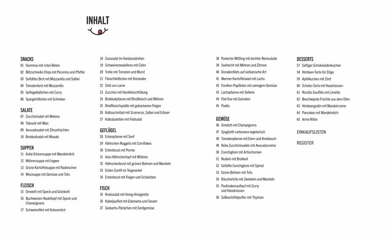 Lust auf einen kleinen Vorgeschmack? Diese und viele weitere schnelle und einfache Gerichte entstehen mit dem grandiosen Kochbuch im Handumdrehen: Schinken-Spargel-Röllchen, Salsiccia-Pasta, Thai-Wildreis-Topf, Chili con Carne, Paella, Veggi-Carbonara, Süßkartoffelpuffer, Himbeertorte, Ricotta-Limetten-Soufflée und vieles mehr.