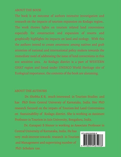 Kodagu is a fragile eco- region and rapid tourism growth is noticed in this district. With expanding tourism activities; huge agricultural land are also being converted into commercial plots. There are many tourism infrastructures are coming up in the district to meet the needs of tourists and resorts are the major expanding accommodation facilities occupying large land area. During the Research mass land conversions for tourism in Kodagu was noticed and it is concerning issue in terms of the district's future. Thus, in this book we are bringing forward the same concern in a way that everyone can understand with the help of simple and clear image based analysis. We hope the issue of Kodagu Resorts and Land Conversions: A Geo Spatial Analysis would reach the concerned authorities, local people and the national and international policy makers for effective planning and implementation of sustainable development strategies.