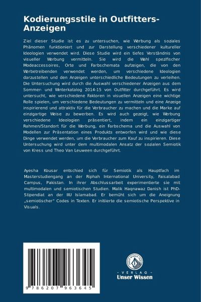 Ziel dieser Studie ist es zu untersuchen, wie Werbung als soziales Phänomen funktioniert und zur Darstellung verschiedener kultureller Ideologien verwendet wird. Diese Studie wird ein tiefes Verständnis von visueller Werbung vermitteln. Sie wird die Wahl spezifischer Modeaccessoires, Orte und Farbschemata aufzeigen, die von den Werbetreibenden verwendet werden, um verschiedene Ideologien darzustellen und den Anzeigen unterschiedliche Bedeutungen zu verleihen. Die Untersuchung wird durch die Auswahl verschiedener Anzeigen aus dem Sommer- und Winterkatalog 2014-15 von Outfitter durchgeführt. Es wird untersucht, wie verschiedene Faktoren in visuellen Anzeigen eine wichtige Rolle spielen, um verschiedene Bedeutungen zu vermitteln und eine Anzeige inspirierend und attraktiv für die Verbraucher zu machen und die Marke auf einzigartige Weise zu bewerben. Es wird auch gezeigt, wie Werbung verschiedene Ideologien präsentiert, indem ein einzigartiger Rahmen/Standort für die Werbung, ein Farbschema und die Auswahl von Modellen zur Präsentation eines Produkts entworfen wird und wie diese Dinge verwendet werden, um die Verbraucher zum Kauf zu inspirieren. Diese Untersuchung wird unter dem multimodalen Ansatz der sozialen Semiotik von Kress und Theo Van Leuween durchgeführt.